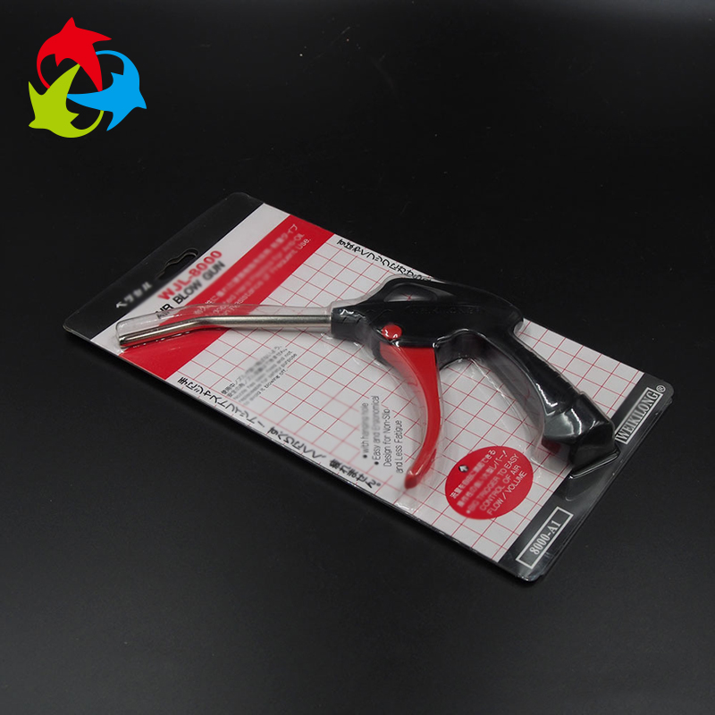 该产品属于三折边吸塑罩,是一种插卡形式的包装,吸塑围绕点火器而成型,完全贴合,飞机孔可以便于悬挂。