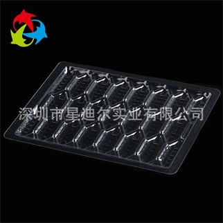 特点:本款产品是由深圳吸塑厂依据产品实物形状而实际定做的吸塑制品,能够完美跟形产品大小,和实物贴合度好;五金零件吸塑托盘材质环保无公害,可降解性强,对环境无污染;五金零件吸塑托盘采用材质颜色透明,有便于顾客购买时的挑选;所用托盘设计形式,方便安放和取出,能够盛装多件五金零件实物,节省空间、节约成本。