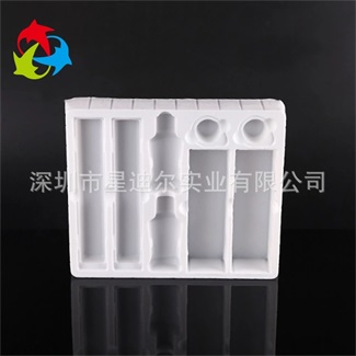 本款产品是吸塑加工厂依据客户提供的实物和相关要求而是设计定做的一款吸塑产品,采用环保白色PET片材为原材料,在保证对环境无公害的同时也能便于客户在购买时的挑选。化妆品吸塑盒能够装多款化妆品产品,贴合度完好,便于安放和取出。