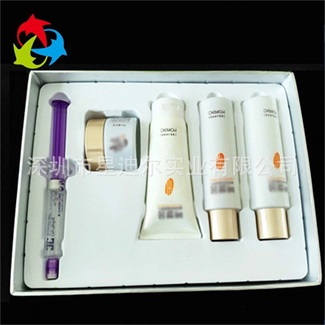 本款产品是依据客户提供的实物和相关要求而自行设计定做的一款吸塑产品,采用环保白色PS植绒片材为原材料,在保证对环境无公害的同时也能便于客户在购买时的挑选。化妆品植绒吸塑选用独特的内托设计形式,在使使产品看上去更加美观的同时,便于产品的放入和取出。化妆品植绒吸塑一起纯白的颜色能够与实物产品形成一定的反差,有力与产品的展示和销售。